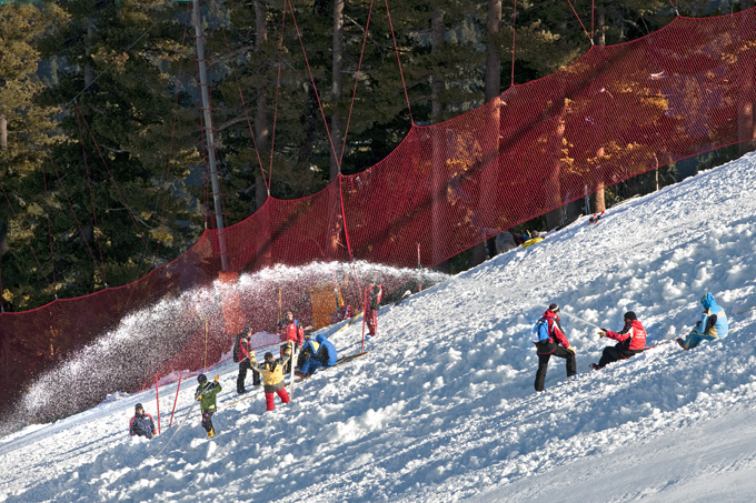 Weltcup-Strecke der Ski-Profis hier nebenan ist, die sie gerade noch präparieren, und wie waghalsig sie diese Strecke hinunter knallen.